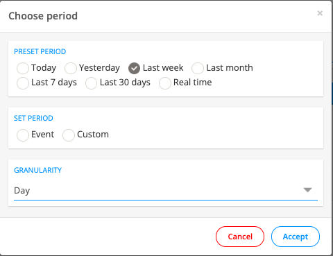 You will be also able to select the granularity, this means the precision in which the data will be shown. For example, by hor/day/week/month/year.