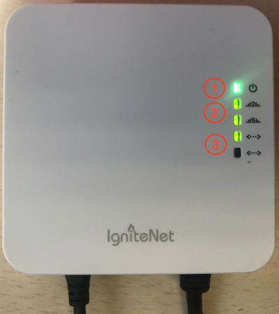 LED de encendido en rojo y LED de conexión inalámbrica y ETH0 en verde o parpadeando en verde