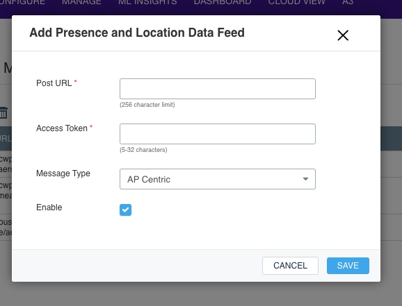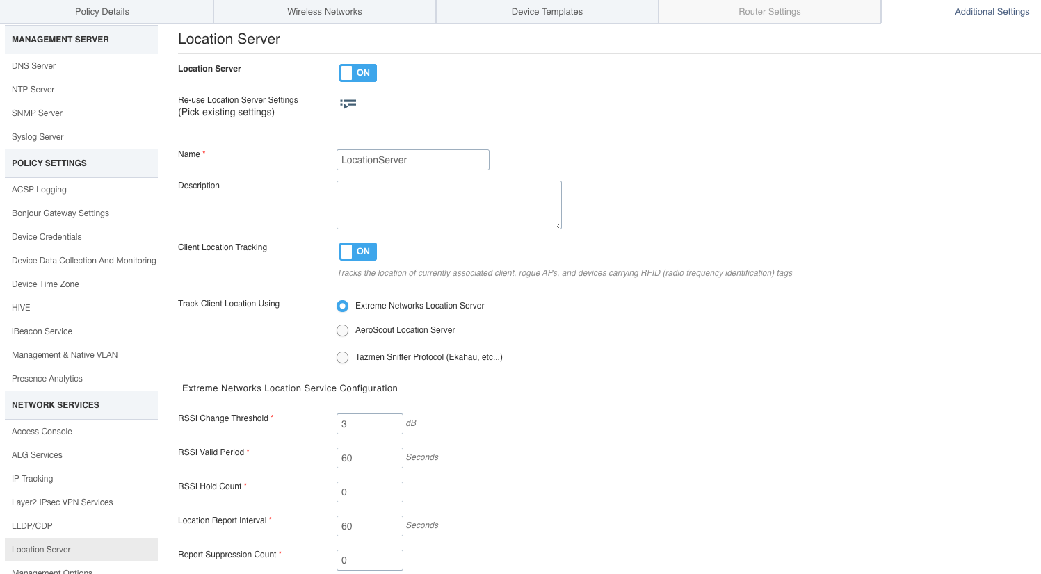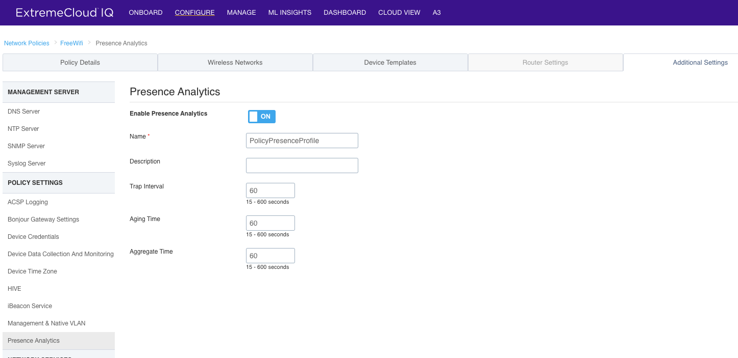 Once you have a wireless network configuration, you must go in the same 'Network Policy' to 'Addition Settings' and is required to be turned on 'Presence Analytics' and 'Location Server'.