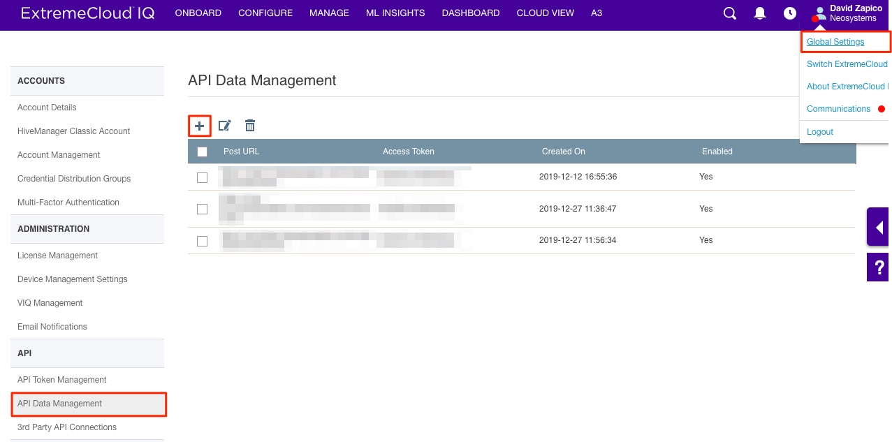 Now need activate Webhooks settings to send the data to Flame Analytics, for that you have to access to the Global settings section and go to the "API Data Management"